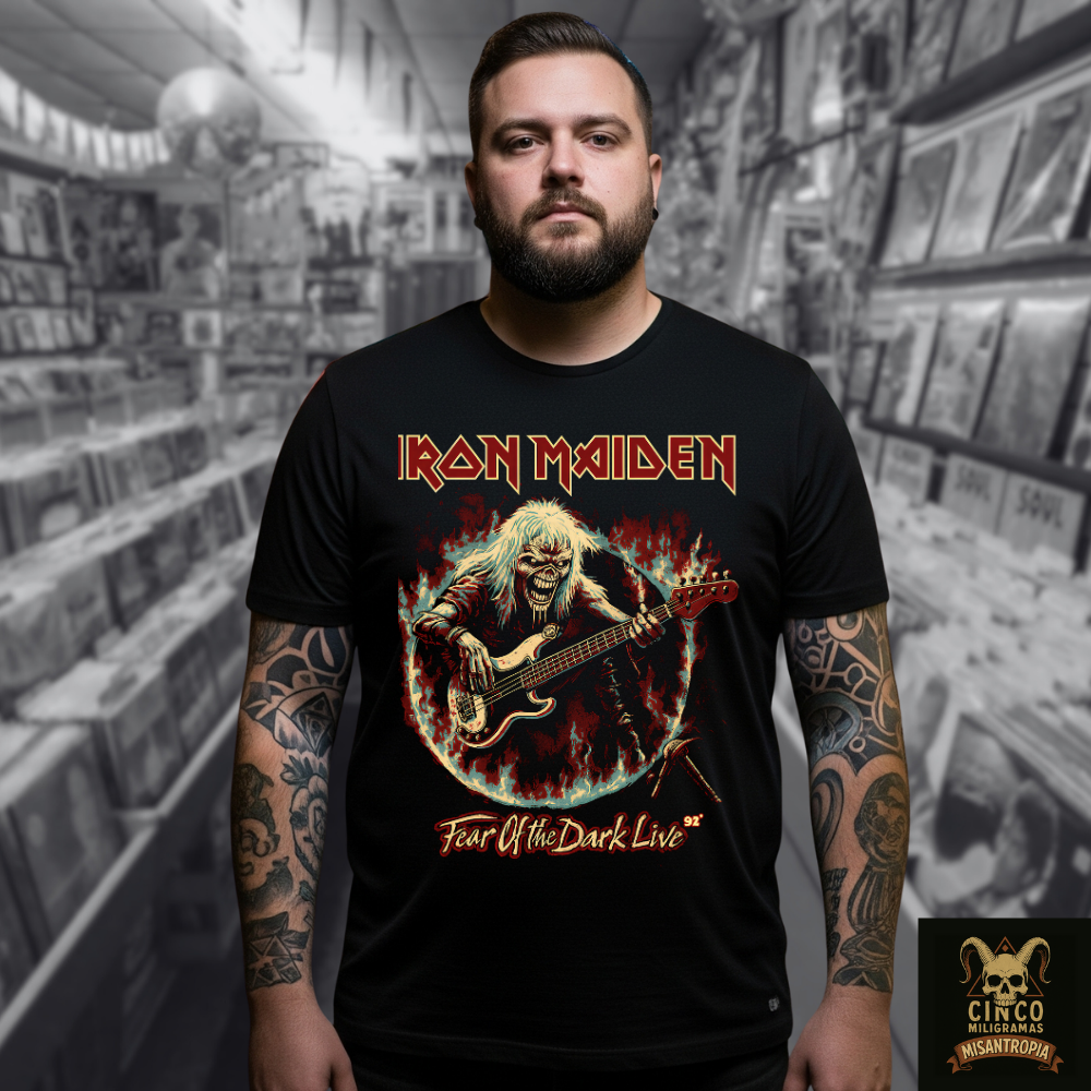 Uma explosão sonora encarnada em tecido. Esta camiseta traz Eddie — o ícone supremo do Iron Maiden — em sua forma mais frenética e demoníaca, rasgando as cordas de um baixo como se conjurasse o próprio inferno sonoro. Cercado por chamas azuladas e vermelhas, seu sorriso macabro ilumina a escuridão do palco, enquanto um microfone tombado sugere o fim de uma batalha vocal. A arte celebra a lendária turnê Fear of the Dark Live de 1992, capturando a energia selvagem que incendiou plateias ao redor do mundo. Ideal para quem carrega no peito o legado de um som que desafia o tempo, o bom gosto e os fracos de espírito.