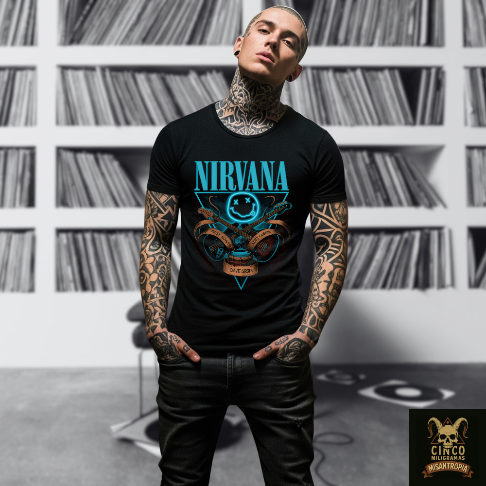 Mais do que uma camiseta, esta é uma celebração gráfica do som que quebrou a estética plastificada dos anos 90. O logo "smiley" distorcido de Nirvana brilha como um letreiro de bar decadente, cercado por os instrumentos de guerra de Kurt Cobain, Krist Novoselic e Dave Grohl — os três nomes que redefiniram o rock com ruído, dor e autenticidade.